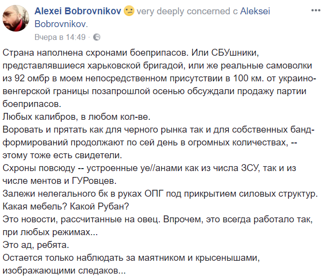 "Страна наполнена схронами боеприпасов. Или эсбэушники, представлявшиеся харьковской бригадой, или же реальные самоволки из 92-й омбр – в моем непосредственном присутствии в 100 км от украино-венгерской границы позапрошлой осенью обсуждали продажу партии боеприпасов.
