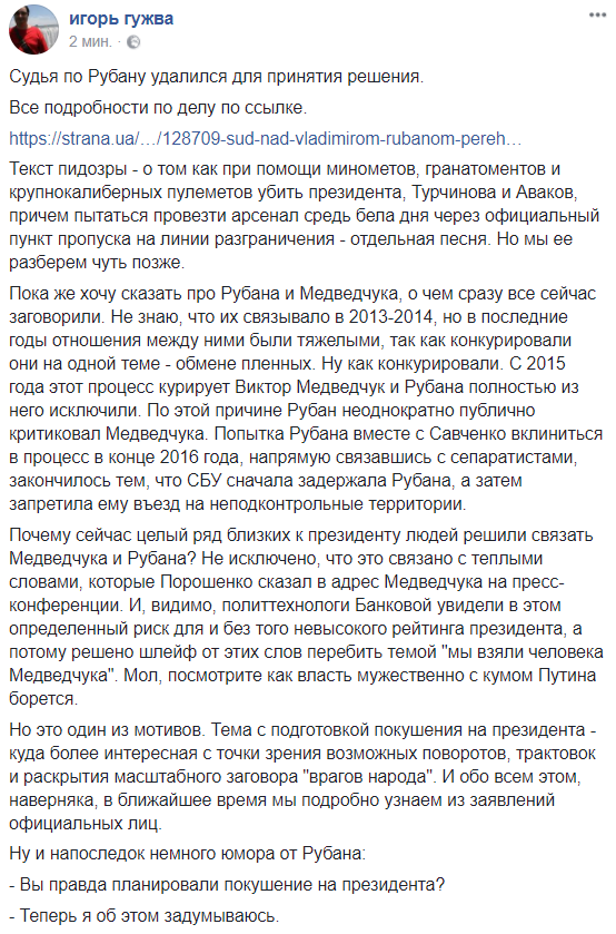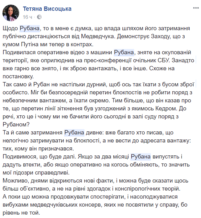 "... Хочу сказать про Рубана и Медведчука, о чем сразу все сейчас заговорили. Не знаю, что их связывало в 2013-2014-е, но в последние годы отношения между ними были тяжелыми, так как конкурировали они на одной теме – обмене пленных. Ну как конкурировали. С 2015 года этот процесс курирует Виктор Медведчук и Рубана полностью из него исключили. По этой причине Рубан неоднократно публично критиковал Медведчука. Попытка Рубана вместе с Савченко вклиниться в процесс в конце 2016 года, напрямую связавшись с сепаратистами, закончилась тем, что СБУ сначала задержала Рубана, а затем запретила ему въезд на неподконтрольные территории.