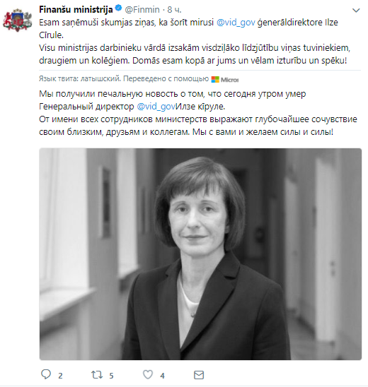 Глава правительства также выразил соболезнования семье и друзьям Цируле. Соболезнования близким от имени всех работников выразила консультант Службы госдоходов по связям с общественностью Елена Зандер.