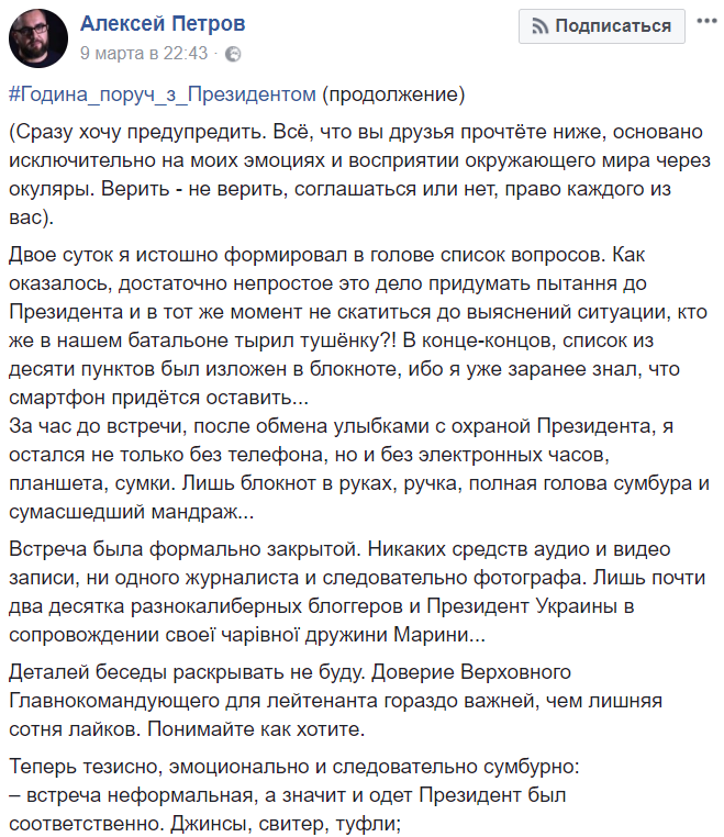 Позже он компенсировал свой "проступок" ярким панегириком. Вот как он описывает встречу с Порошенко: