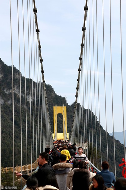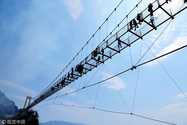 По данным телеканала, все желающие могут "пощекотать себе нервы" прогулкой между двумя горными пиками. Длина висячего моста составляет 198 метров: при этом полотно выполнено из прозрачных стеклянных панелей шириной 2,5 метра.