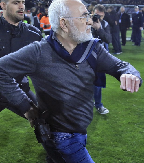 Судья не засчитал мяч команды ПАОК из-за офсайда. После этого Саввидис, на поясе которого висел пистолет в кобуре, выбежал на поле в сопровождении охраны и стал угрожать арбитру.
