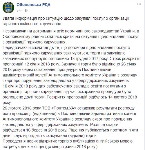 "Несмотря на соблюдение всех норм действующего законодательства Украины, в Оболонском районе сложилась критическая ситуация по предоставлению услуг по организации горячего питания", - отмечается в сообщении.