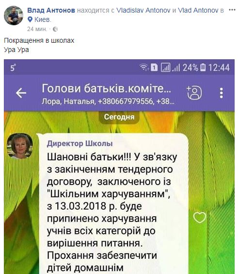 Аналогичное объявление разместил в Facebook Влад Антонов. "Покращення в школах. Ура, ура", - написал он.
