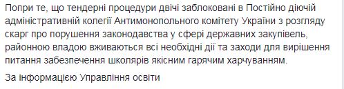 В РГА пишут, что "предвидя заранее то, что договоры о предоставлении услуг по организации горячего питания заканчиваются торги на закупку указанных услуг было объявлено 13 декабря 2017 года". "Срок раскрытия предложений 12 января 2018 года. Указанные торги были отменены 26 января 2018 года через обжалование процедуры в Постоянно действующей административной коллегии Антимонопольного комитета Украины по рассмотрению жалоб о нарушении законодательства в сфере государственных закупок. 10 января 2018 года для обеспечения учреждений образования услугами по организации горячего питания во время обжалования процедуры были объявлены вторые торги. Раскрытие предложений состоялось 14 февраля 2018 года", - говорится в сообщении.