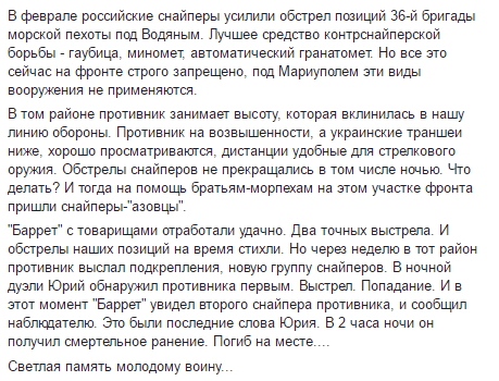 "Обстрелы снайперов не прекращались в том числе ночью. Что делать? И тогда на помощь братьям-морпехам на этом участке фронта пришли снайперы -"азовцы". "Баррет" с товарищами отработали удачно. Два точных выстрела. И обстрелы наших позиций на время стихли. Но через неделю в тот район противник выслал подкрепления, новую группу снайперов. В ночной дуэли Юрий обнаружил противника первым. Выстрел. Попадание. И в этот момент "Баррет" увидел второго снайпера противника, и сообщил наблюдателю. Это были последние слова Юрия. В 2 часа ночи он получил смертельное ранение", -написал Бутусов.