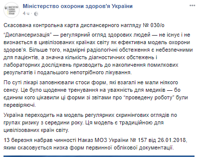 Министерство здравоохранения отменило диспансеризацию украинцев и контрольную карту диспансерного осмотра. С середины года для групп риска будут проводиться лишь скрининговые осмотры. Об этом сообщает пресс-служба Минздрава на странице в Facebook.
