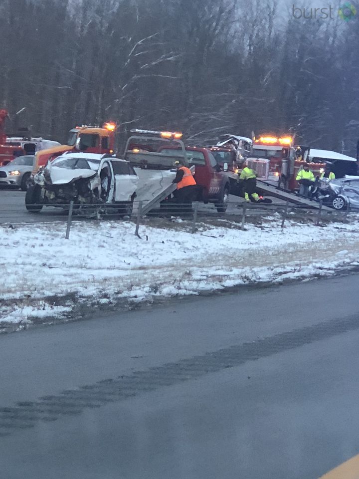 В результате массовой аварии несколько человек получили травмы, их доставили в больницы. Полиция назвала главной причиной происшествия сильный снегопад, из-за которого ухудшилась видимость на дороге.