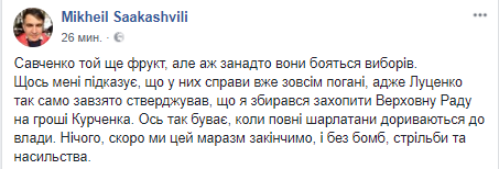 "Савченко тот ещё фрукт, но уж слишком они боятся выборов. Что-то мне подсказывает, что у них дела совсем уж плохи, ведь Луценко с таким же рвением утверждал, что я собирался захватить Верховную Раду на деньги Курченко. Вот так бывает, когда полные шарлатаны дорываются до власти. Ничего, скоро мы этот маразм закончим, и без бомб, стрельбы и насилия", - написал Саакашвили.