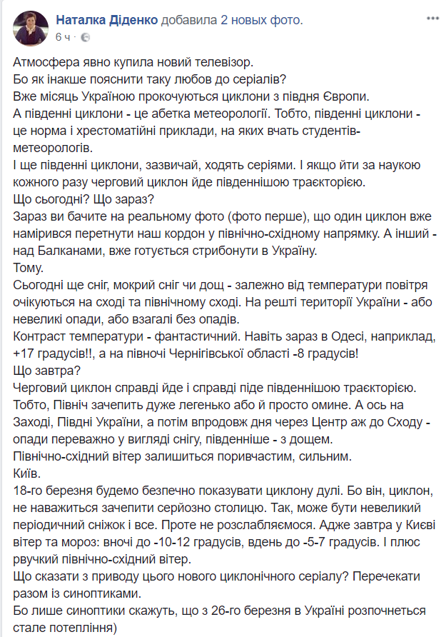 По ее словам, Украину уже месяц атакуют циклоны с юга Европы. И что интересно – южные циклоны обычно ходят "сериями".