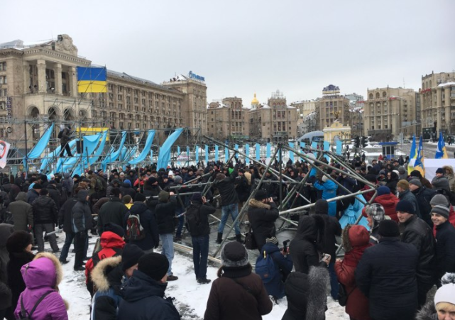 Во время марша активисты РНС разбирали "елку" - металлоконструкции, установленные здесь ранее. Конструкции на Майдане почти доломали.
