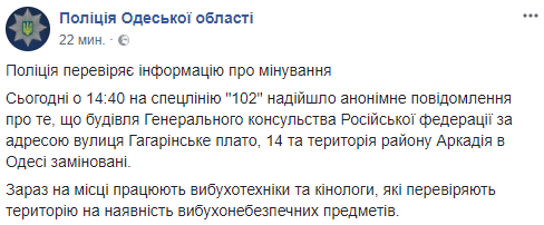 Сегодня в 14:40 на спецлинии "102" поступило анонимное сообщение о том, что здание Генерального консульства Российской Федерации по адресу улица Гагаринское плато, 14 и территория района Аркадия в Одессе заминировано. Это уже второе сообщение за сегодня, в день проведения выборов президента России.