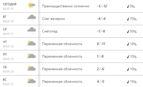 Сайт Weather.com сообщает, что до среды днем будет держаться минусовая температура -1...-3. С четверга днем ожидается плюсовая температура +1...+4. Снег возможен 20 и 21 марта.