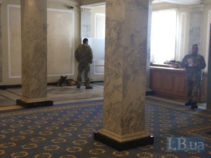 Группа людей в камуфляжной форме с несколькими собаками провела проверку кулуаров Рады, гардеробных и всех входов в здание парламента. После чего, группа подписала акт о проведении осмотра.