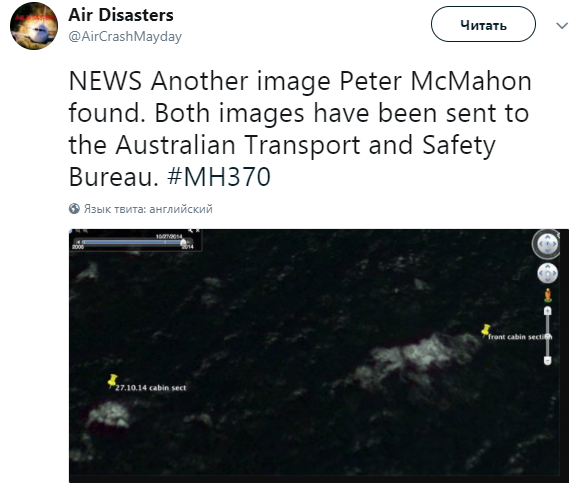 Австралиец несколько лет изучал изображения NASA и Google Maps, чтобы найти Boeing в Индийском океане. Он утверждает, что нашел снимок, на котором может быть затонувший самолет. По словам Макмахона, на фото виден не только корпус, но и то, что Boieng покрыт пулевыми отверстиями.