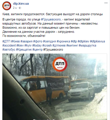 В среду, 21 марта, водители киевских маршруток устроили на улице Грушевского акцию протеста, движение транспорта в месте проведения митинга затруднено. Об этом сообщили в сообществе dtp.kiev.ua, опубликовав соответствующее фото.
