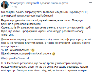Министр инфраструктуры Владимир Омелян прокомментировал действия водителей маршруток на своей странице в Facebook. Он утверждает, что все это кампания по его дискредитация. Но добавил, что он рад что идея сооружения тестовой площадки HypeUA в 2019 на слуху, и новое слово Гиперлуп вошло в украинский лексикон.