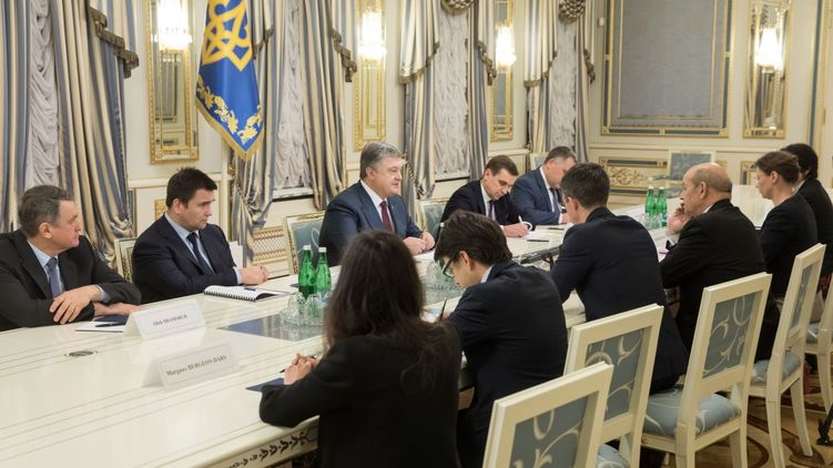 "Президент Петр Порошенко принял министра по делам Европы и иностранных дел Франции Жана-Ива Ле Дриана", – сказано в сообщении на сайте украинского президента.
