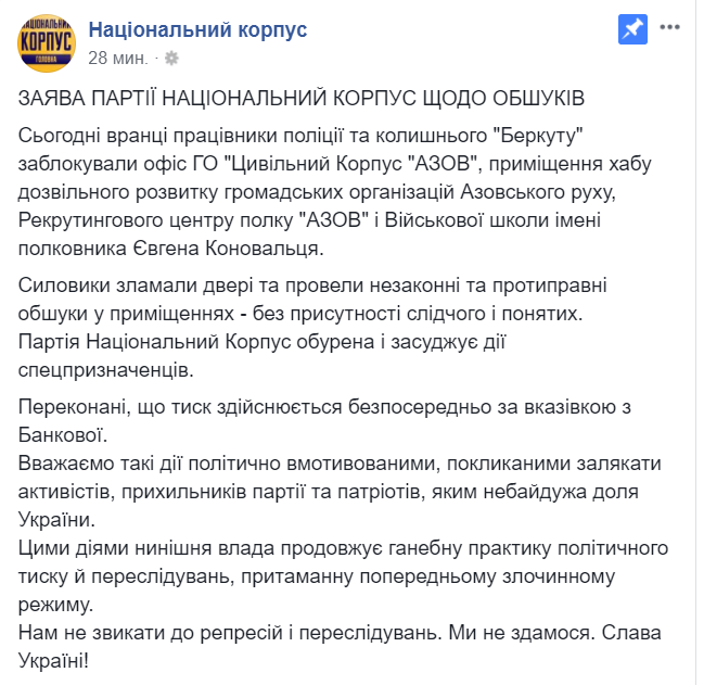 "Полиция ворвалась внутрь и все там заблокировала. Никого не пропускают. Недавно пустили только Билецкого", – заявили в Нацкорпусе.