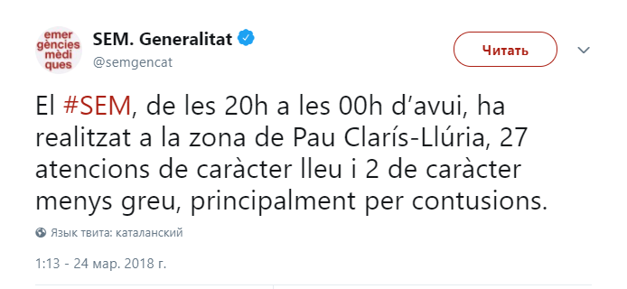 С 20 часов до полуночи за медицинской помощью обратились 29 человека, получившие легкие травмы, в основном ушибы, сообщил в ночь на субботу, 24 марта, департамент здравоохранения каталонского Женералитата.