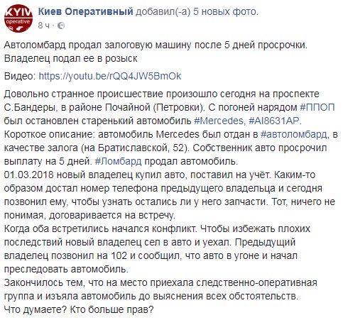 "Короткое описание: автомобиль Mercedes был отдан в автоломбард, в качестве залога (на Братиславской, 52). Собственник авто просрочил выплату на 5 дней. Ломбард продал автомобиль. Новый владелец купил авто, поставил на учёт. Каким-то образом достал номер телефона предыдущего владельца и сегодня позвонил ему, чтобы узнать остались ли у него запчасти. Тот, ничего не понимая, договаривается на встречу", - говорится в сообщении.