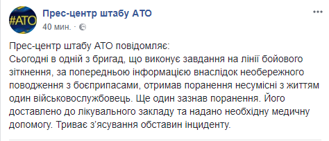 "Сегодня в одной из бригад, которая выполняет задания на линии боевого соприкосновения, по предварительной информации в результате неосторожного обращения с боеприпасами, получил ранения, несовместимые с жизнью один военнослужащий. Еще один получил ранения", - говорится в сообщении.