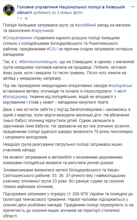 В Киевской области банда рецидивистов устроила налет на магазин, а потом, уходя от полиции, захватила квартиру, в которой находились бабушка с маленькими детьми.