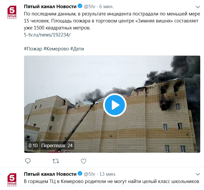 Сегодня, 25 марта, в российском Кемерово вспыхнул торгово-развлекательный комплекс "Зимняя вишня". Погибло как минимум четыре ребенка, которые находились в детской комнате. Многие посетители центра в отчаянии выпрыгивали из окон, чтобы спастись от огня.