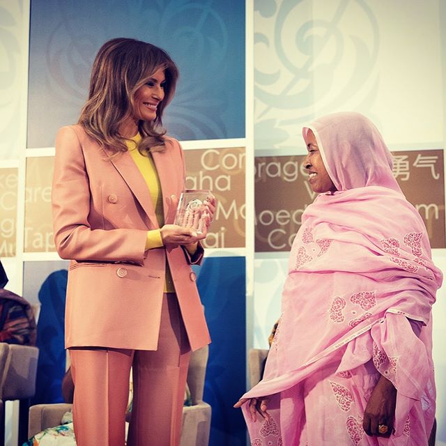 Мелания в костюме цвета георгина вручила женщинам награды "за смелость"