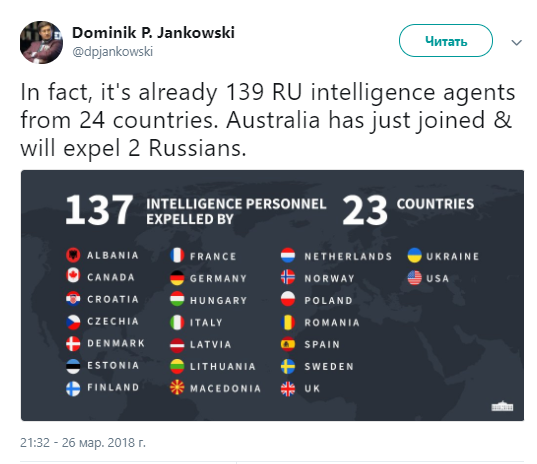 "Фактически, вышлют 139 агентов разведки из 24 стран. Австралия только что присоединилась и выдворит 2 россиян", - сообщил в Twitter руководитель отдела ОБСЕ и отдела восточной безопасности Министерства иностранных дел Польши Доминик Янковский.