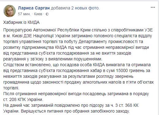 "Прокуратура АРК совместно с представителями управления защиты экономики в Киеве департамента защиты экономики Нацполиции Украины задержали главного специалиста отдела торговли управления торговли и быта департамента промышленности и развития предпринимательства КГГА во время получения неправомерной выгоды от представителя субъекта хозяйствования за непринятие мер реагирования в связи с выявленными нарушениями", - написала Сарган.