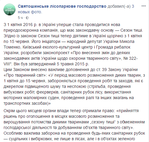 В Украине с 1 апреля по 15 июня будет действовать так называемый сезон тишины. В этот период будет запрещено проведение в лесах и зеленых зонах мероприятий и работ, являющихся источниками повышенного шума и беспокойства. Об этом сообщается на странице Святошинского лесопаркового хозяйства в Facebook.
