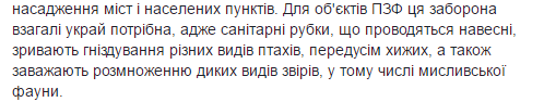 "Особенно важен запрет на проведение любых санитарных рубок - сплошных и выборочных, не только в лесах, но и в зонах зеленых насаждений городов и населенных пунктов. Для объектов природного заповедного фонда этот запрет вообще крайне необходим, ведь санитарные рубки, проводимые весной, срывают гнездование различных видов птиц, прежде всего хищных, а также мешают размножению диких видов животных, в том числе охотничьей фауны", - говорится в сообщении.