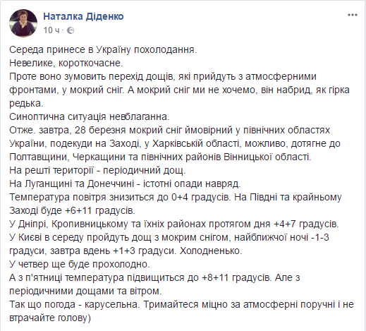 "Итак, завтра, 28 марта мокрый снег вероятен в северных областях Украины, на Западе, в Харьковской области, возможно, дотянет до Полтавщины, Черкасской и северных районов Винницкой области. На остальной территории - периодический дождь. На Луганщине и Донетчине - существенные осадки будут вряд ли. Температура воздуха понизится до 0 + 4 градусов. На юге и крайнем Западе будет + 6 + 11 градусов. В Днепре, Кропивницком - в течение дня +4 +7 градусов", - написала Диденко.