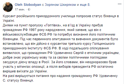 В ходе дальнейшего общения оказалось, что гражданин РФ Удовиченко Сергей является этническим украинцем, хорошо знает украинский язык и по своим политическим взглядам осуждает действующую власть в России. По его словам, он неоднократно участвовал в митингах оппозиции, а после выборов президента РФ окончательно решил уехать в Украину. На данный момент решается вопрос о предоставлении гражданину РФ Удовиченко С. статуса беженца", - сообщил Олег Слободян.