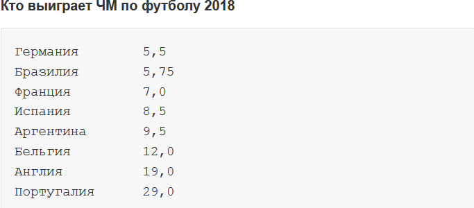 Букмекеры не стали делать серьезных выводов и резких движений после состоявшихся контрольных матчей национальных сборных. Даже разгром в игре с испанцами (1:6) не пошатнул достаточно высокое положение в букмекерском рейтинге сборной Аргентины, ставки на победу которой в ЧМ-2018 принимаются с коэффициентом 9,5.
