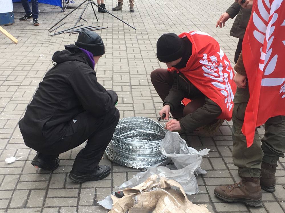 Около него стоят порядка 40 молодых людей в камуфляже. Натягивают "символическую" колючку из сетки-рабицы.