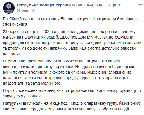 В Виннице полиция задержала предполагаемого грабителя, который совершил разбойное нападение на магазин. Об этом говорится на странице патрульной полиции в Facebook.