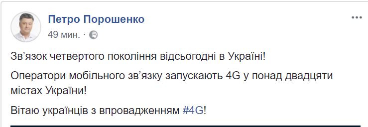 Президент Петр Порошенко на своей странице в Facebook поздравил украинцев с запуском cкоростного формата передачи данных 4G