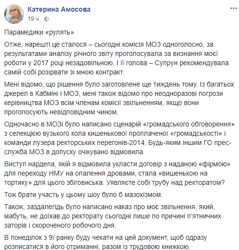 30 марта Комиссия Минздрава рекомендовала уволить Амосову с поста ректора НМУ. Причина увольнения - невыполнение контракта. Договор с ней подписан на 7 лет, проработала она же всего три.