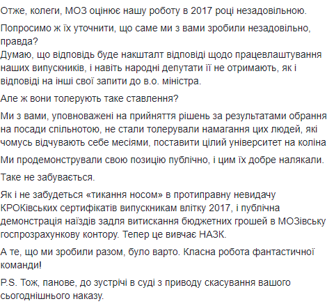 20 февраля Минздрав отстранил от работы ректора НМУ Амосову. Согласно сообщению, ректора отстранили из-за того, что студенты стоматологического факультета не смогли сдать обязательный для продолжения обучения экзамен "Шаг 1. Стоматология".
