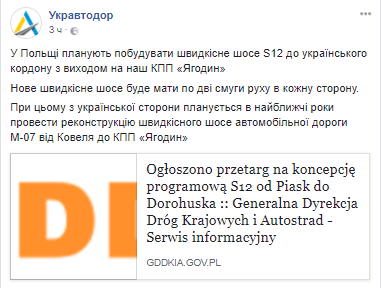 "В Польше планируют построить скоростное шоссе S12 до украинской границы с выходом на наш КПП "Ягодин". Новое скоростное шоссе будет иметь по две полосы движения в каждую сторону", - говорится в сообщении.