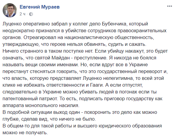 "Луценко оперативно забрал у коллег дело Бубенчика, который неоднократно признался в убийстве сотрудников правоохранительных органов. Отреагировал на националистическую общественность, утверждающую, что героев нельзя обвинять, судить и сажать.