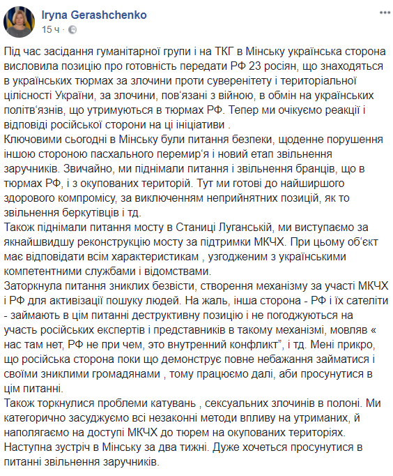 "Во время заседания гуманитарной группы в Минске украинская сторона выразила позицию о готовности передать РФ 23 россиян, находящихся в украинских тюрьмах за преступления против суверенитета и территориальной целостности Украины, за преступления, связанные с войной, в обмен на украинских политических  заключенных, содержащихся в тюрьмах РФ.