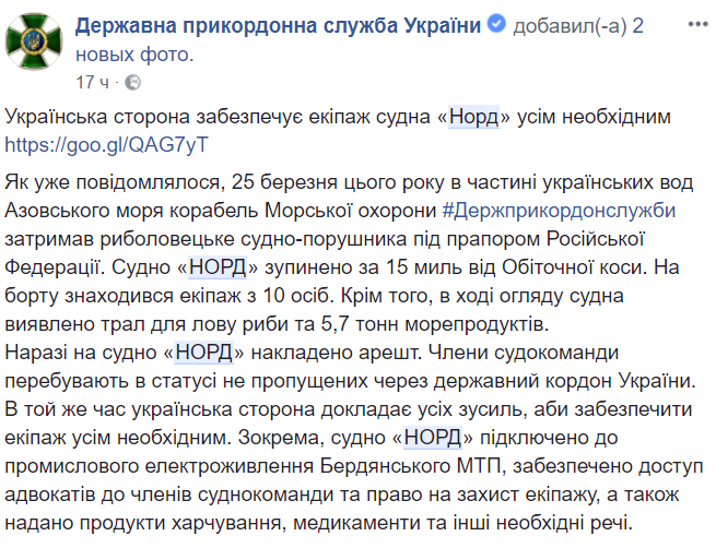 26 марта в украинских водах Азовского моря пограничники задержали рыболовецкое судно под флагом России. На борту находился экипаж из десяти человек.