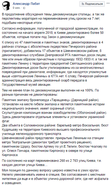 По его данным, к списку из 47 памятников и памятных знаков, демонтированных в 4 районах столицы с абсолютным лидерством Печерского района, добавились 17 объектов в Шевченковском районе, 8 демонтированных службами Днепровской РГА памятных досок лицам, причастным к голодомору 1932-1933 гг, а так же памятники Ленину с территории предприятий Святошинского района.