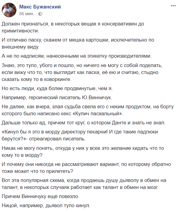 Блогер Макс Бужанский обсуждает слова писателя Винничука, который хотел бы кинуть "куличом в морду". "И почему они никогда не рассматривают вариант, по которому обратно тоже может что-то прилететь?" – рассуждает Бужанский.