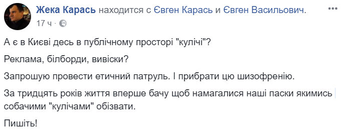 Тему начал "двигать" глава С14. Он предложил провести патруль по Киеву и "убрать эту шизофрению" – вывески с названием "кулич".