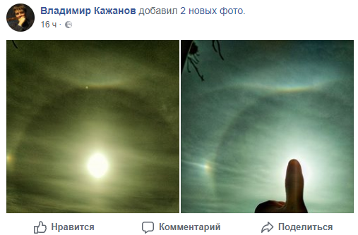 "Гало в небе над Харьковом 5.04.18 !!! Редкое атмосферное явление! Но берегите глаза и камеры, не спали при просмотре и съемке!", - написал в соцсети астроном и добавил, что раньше такие явления в небе воспринимали как знамение.
