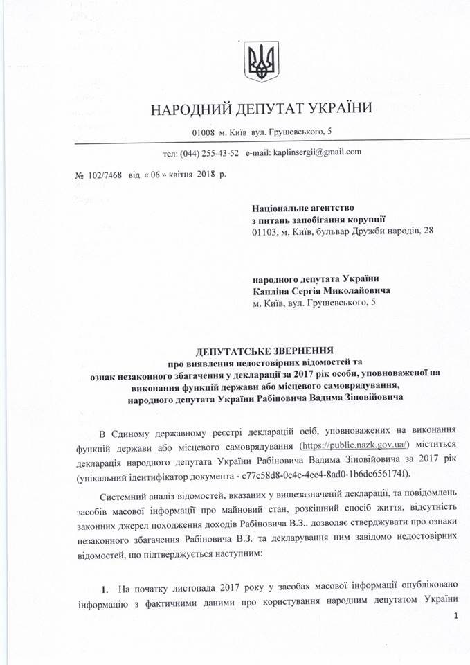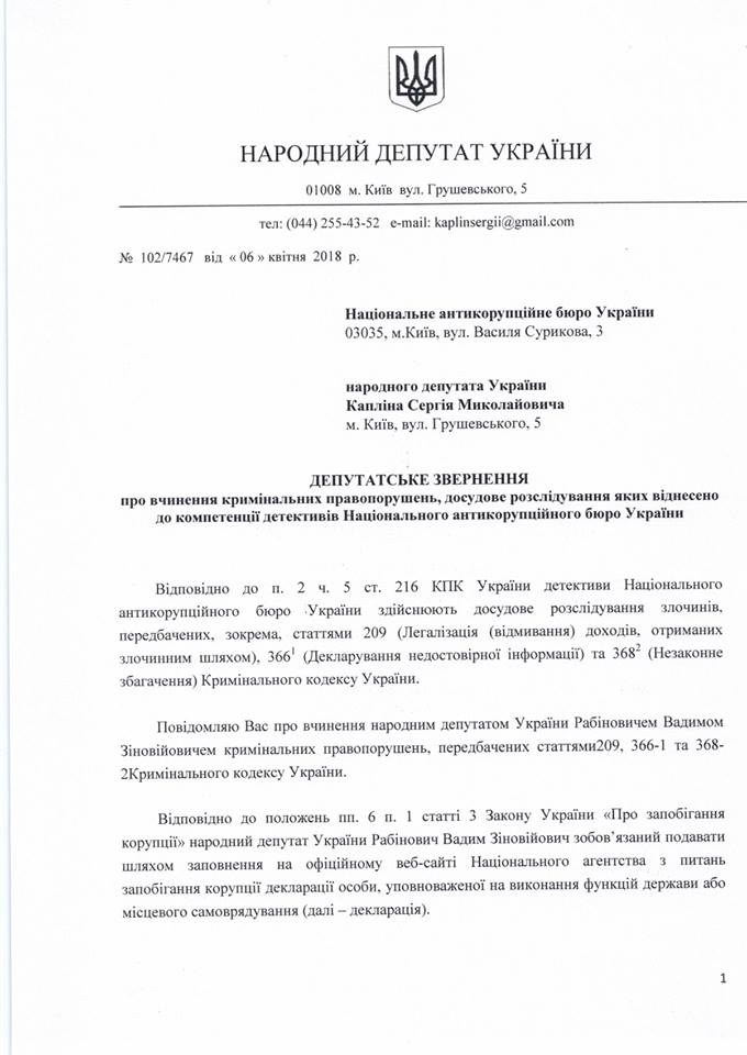 Отметим, что это не первая акция Каплина против Вадима Рабиновича. Ранее нардеп уже посылал запрос с требованием открыть уголовное производство по фактам недостоверного декларирования и незаконного обогащения нардепа Рабиновича, после чего стало известно, что НАБУ расследует два дела против него.